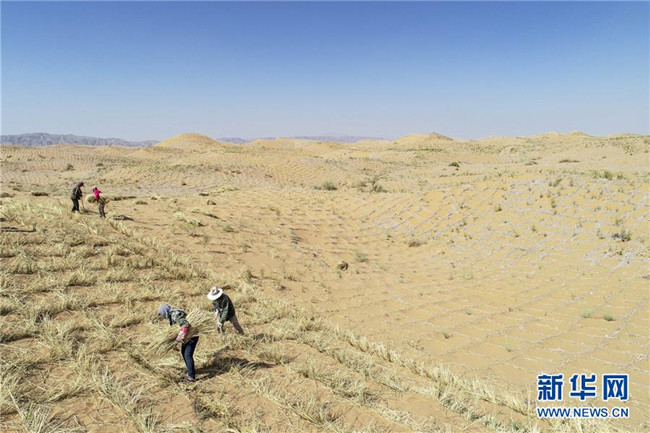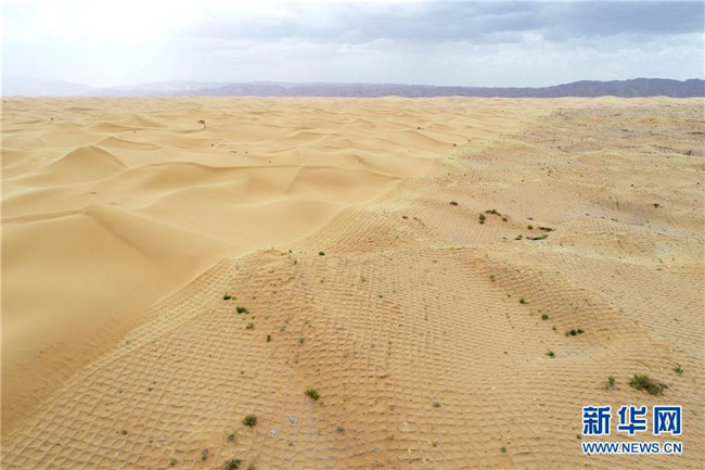 寧夏中衛(wèi)市位于騰格里沙漠南緣,在長期抵抗沙漠化侵襲的實踐和探索中,一套“先固后治,固阻結(jié)合”的防沙治沙新模式在這里應(yīng)用。人們利用草方格固沙,在扎好的草方格中播撒草種,形成植物沙障。據(jù)了解,截至2018年底中衛(wèi)市已完成沙區(qū)治理147萬畝。新華社記者馮開華攝