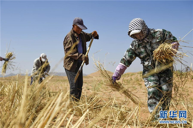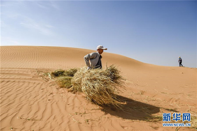 在寧夏中衛(wèi)市長流水沙區(qū),治沙工人在沙漠中搬運麥草(6月13日攝)。新華社記者馮開華攝