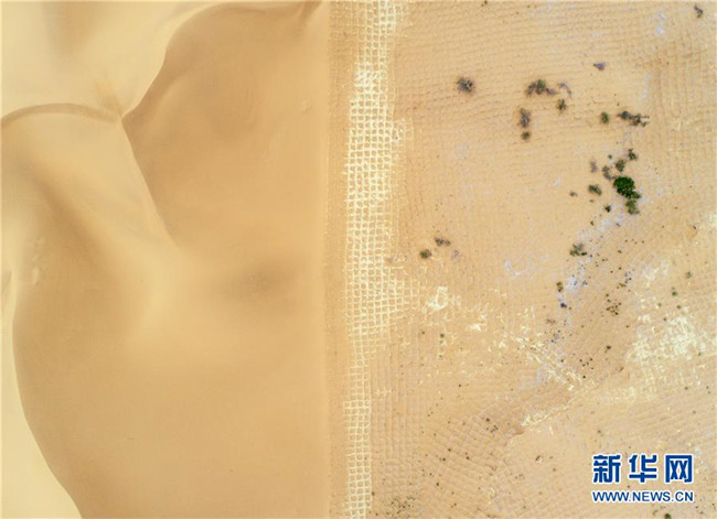 寧夏中衛(wèi)市長流水沙區(qū),一邊是沙漠,一邊是用草方格治理后的區(qū)域(6月12日無人機拍攝)。