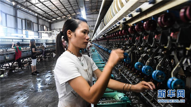 6月18日,在廣西隆林縣輕工業(yè)園區(qū)一家繅絲廠,來(lái)自易地扶貧搬遷安置點(diǎn)的群眾在“扶貧車間”紡紗。
