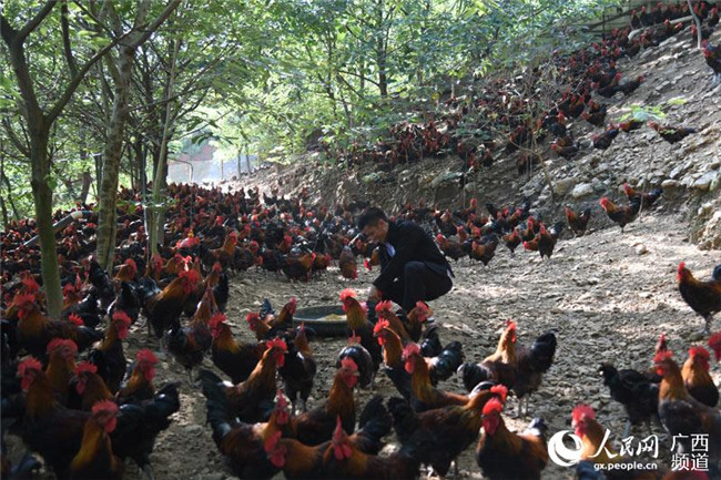 潞城瑤族鄉(xiāng)豐防村黨支部書記梁少生對(duì)養(yǎng)殖雞進(jìn)行悉心管護(hù)