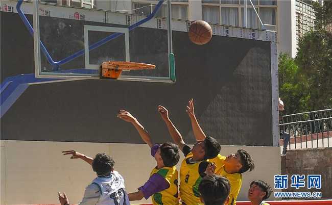 鹽井中學(xué)的學(xué)生們?cè)隗w育課上打籃球(6月6日攝)。年輕的藏族女教師坐在鋼琴前,手指靈動(dòng)地彈奏樂(lè)曲,兩名學(xué)生拉起弦子伴奏,三十多名學(xué)生站成四排,齊聲合唱。學(xué)?;@球場(chǎng)上數(shù)名身材高大的學(xué)生,正在體育老師的組織下進(jìn)行激烈的分組對(duì)抗,不一會(huì)兒,學(xué)生們個(gè)個(gè)汗流浹背。綜合樓三樓的化學(xué)實(shí)驗(yàn)室內(nèi),身穿白色大褂的學(xué)生,分成若干小組,正在做簡(jiǎn)單的化學(xué)實(shí)驗(yàn)。這一幕幕,同時(shí)出現(xiàn)在西藏昌都市芒康縣鹽井中學(xué)。新華社記者晉美多吉攝