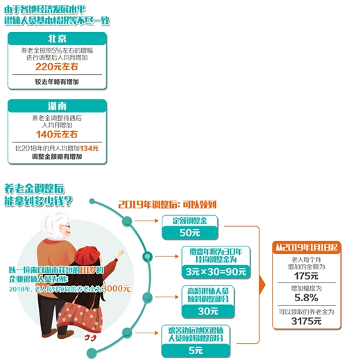 比如,北京市人力資源和社會(huì)保障局發(fā)布的調(diào)整方案顯示,養(yǎng)老金按照5%左右的增幅進(jìn)行調(diào)整后,人均增加220元左右,較去年略有增加;湖南省公布的退休人員養(yǎng)老金調(diào)整方案顯示,養(yǎng)老金調(diào)整后,人均月增加金額為140元左右,比2018年的月人均增加134元,調(diào)整金額略有增加;寧夏決定從2019年1月1日起調(diào)整全區(qū)企業(yè)和機(jī)關(guān)事業(yè)單位退休人員基本養(yǎng)老金,其中企業(yè)提高比例為5.5%,機(jī)關(guān)事業(yè)單位提高比例為4%,預(yù)計(jì)全區(qū)共有63.67萬(wàn)人受益。