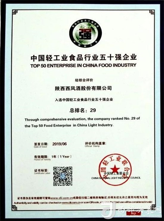 “中國輕工業(yè)食品行業(yè)五十強企業(yè)”榜單是評價輕工業(yè)食品企業(yè)競爭力的權(quán)威榜單,也是衡量中國輕工業(yè)食品企業(yè)發(fā)展活力的重要標(biāo)準(zhǔn)。此次榜單在評選標(biāo)準(zhǔn)上重點考量了2018年度參評企業(yè)的營業(yè)收入、利潤總額、營業(yè)收入利潤率、稅收占利稅比重、研發(fā)投入及營業(yè)收入增速六項指標(biāo)綜合評分,力求結(jié)合互聯(lián)網(wǎng)時代特征對企業(yè)進(jìn)行充分全面的評估,要求企業(yè)不僅能夠?qū)崿F(xiàn)均衡發(fā)展,還要具備較強的市場活力。西鳳股份公司憑借出色的經(jīng)營業(yè)績和綜合表現(xiàn),獲得了大會的一致認(rèn)可。