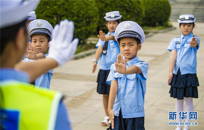 7月9日,武邑縣公安交警大隊的民警指導“小交警”學習交通指揮手勢。新華社記者 李曉果 攝