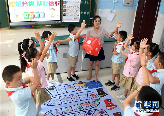 7月11日,合肥市建平實驗小學(xué)學(xué)生在老師引導(dǎo)下參與垃圾分類小游戲。