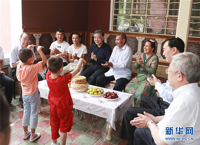 7月14日至16日,第七次全國對口支援新疆工作會議在新疆和田召開。中共中央政治局常委、中央新疆工作協(xié)調小組組長汪洋出席會議并講話。在和田期間,汪洋還參觀了對口援疆工作成就展,考察了有關單位和企業(yè),看望了脫貧戶。這是7月15日,汪洋在新疆和田英阿瓦提鄉(xiāng)吐如孜村考察。 新華社記者 丁林 攝