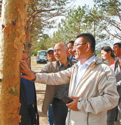 于海俊(前)與苗木專(zhuān)家在察看林場(chǎng)樹(shù)木。新華社發(fā)