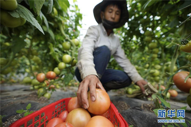 8月5日,河北省張北縣德勝村村民葉建和在收獲西紅柿。新華社記者 邢廣利 攝