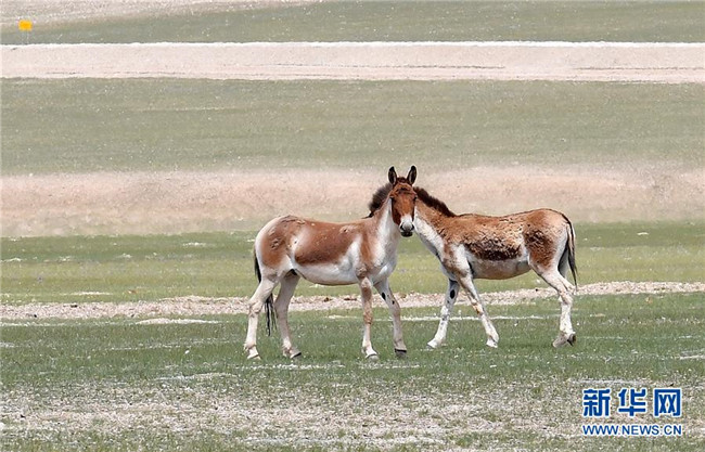 8月4日拍攝的兩頭藏野驢。西藏那曲市尼瑪縣位于西藏西北部,位于羌塘國家級自然保護區(qū)內(nèi),是古老象雄文明的發(fā)祥地之一。這里空氣潔凈,野生動物繁多,深受游客喜愛。新華社記者覺果攝