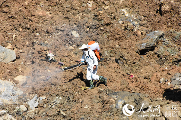 滑坡現(xiàn)場已開展衛(wèi)生防疫工作,防止疫情發(fā)生。城口縣委宣傳部供圖