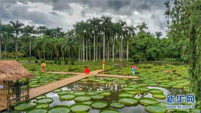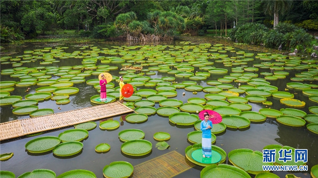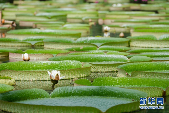 王蓮原產(chǎn)于南美洲熱帶地區(qū),西雙版納熱帶植物園自1963年開始引種,經(jīng)過多年的培育,已成為植物園一張亮麗的名片。每年6月—10月是王蓮的最佳觀賞時間,不少游客都會慕名前來,觀賞這種神奇的植物。新華網(wǎng)發(fā)(張嬌嬌 攝)