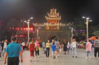華燈初上,北面的小廣場(chǎng)上大媽們繞圈疾步鍛煉身體,小孩騎著滑輪車嬉戲玩耍,年輕人打著羽毛球,古老建筑同現(xiàn)代氣息融合在一起,也是一種特色。