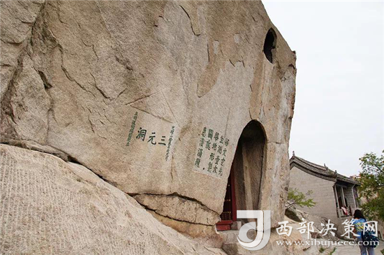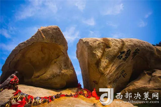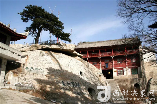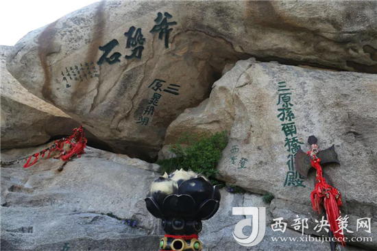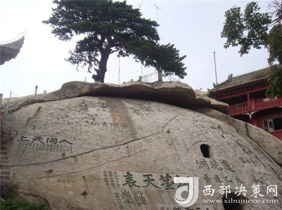 西峰上景觀比比皆是,有翠云宮、蓮花洞、巨靈足、斧劈石、舍身崖等,并伴有許多美麗的神話傳說。峰上崖壁題刻遍布,工草隸篆,琳瑯滿目。峰北絕頂叫西石樓峰,峰上楊公塔為楊虎城將軍所建,塔上有楊虎城將軍親筆題辭。塔下巖石上有"枕破鴻蒙"題刻,是書法家王鐸手跡。