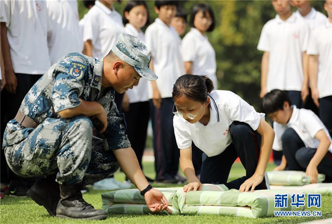 8月27日,河北省衡水市第二中學(xué)高一新生在教官指導(dǎo)下練習整理內(nèi)務(wù)。新華社記者朱旭東攝