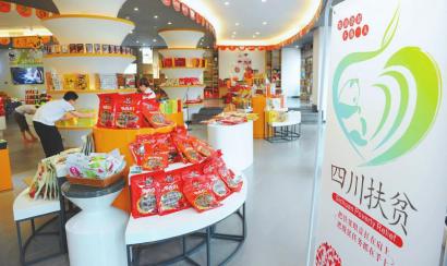 在四川特產(chǎn)購物中心內(nèi)售賣的貼有“四川扶貧”公益性集體商標的產(chǎn)品。四川日報記者何海洋攝