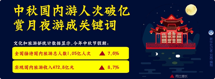 文化和旅游部統(tǒng)計數(shù)據(jù)顯示,今年中秋節(jié)假期,全國接待國內(nèi)旅游總?cè)藬?shù)1.05億人次,同比增長7.6%;實現(xiàn)國內(nèi)旅游收入472.8億元,同比增長8.7%。