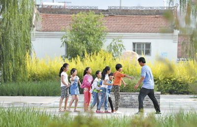 永寧縣原隆村的孩子們在新居前的休閑廣場上玩耍。攝于2018年8月。新華社記者 劉軍喜攝