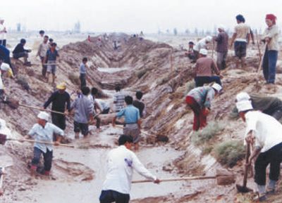永寧縣閩寧鎮(zhèn)建設(shè)初期,群眾在進(jìn)行農(nóng)田水利建設(shè)。攝于1997年7月。新華社發(fā)