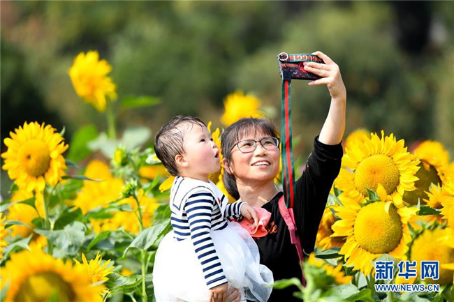 10月10日,家長(zhǎng)和孩子在湖南省森林植物園的向日葵花海中自拍。新華社記者 陳澤國 攝