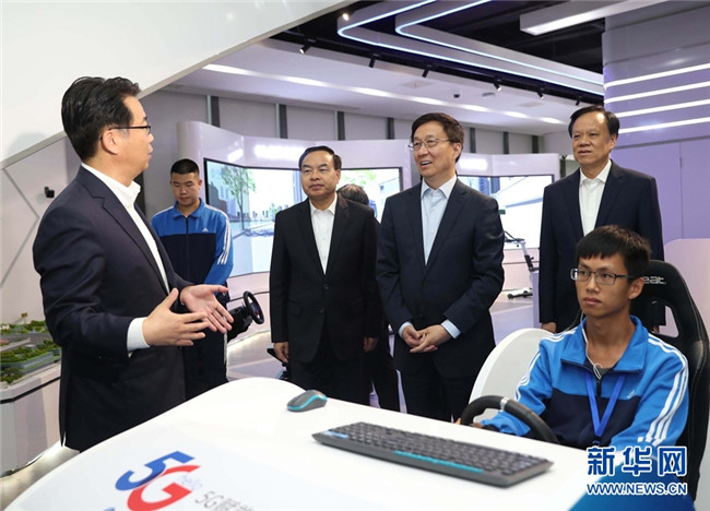 10月14日至15日,中共中央政治局常委、國(guó)務(wù)院副總理韓正在重慶市調(diào)研。這是10月15日,韓正來(lái)到禮嘉智慧公園,了解園區(qū)開(kāi)發(fā)建設(shè)情況,體驗(yàn)智能機(jī)器人和5G技術(shù)在遠(yuǎn)程駕駛、教育、旅游等方面的應(yīng)用。 新華社記者 劉衛(wèi)兵 攝