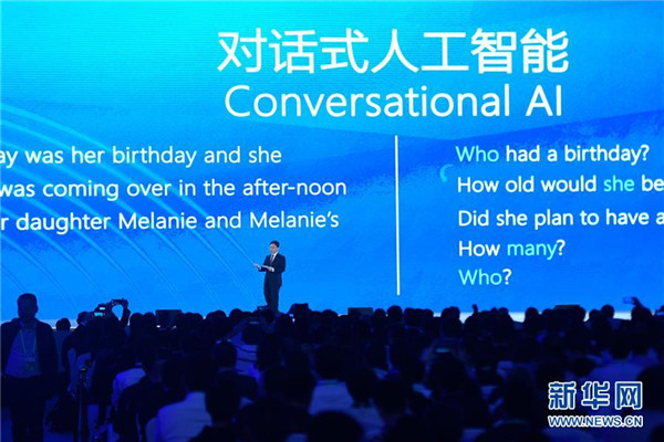 10月20日,微軟公司代表在介紹“統(tǒng)一自然語言預(yù)訓(xùn)練模型與機(jī)器閱讀理解”。 新華社記者 黃宗治 攝