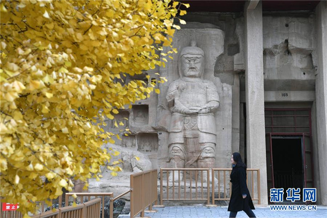 11月5日,游客在甘肅省慶陽市北石窟寺參觀游覽。 新華社記者 馬寧 攝