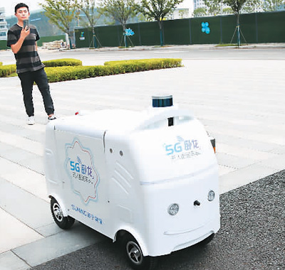 在江蘇南京江北新區(qū)國際健康城,無人配送車在送貨途中自主決策躲避障礙。新華社記者 李雨澤攝 |