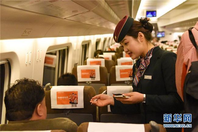 11月16日,在由烏魯木齊開往哈密的D8804次動車組列車上,列車乘務(wù)員為旅客檢票。新華社記者 丁磊 攝