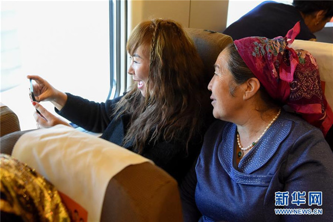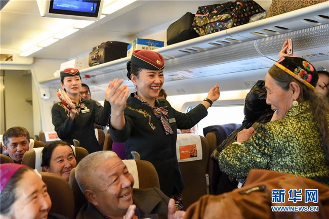 11月16日,在D8804次動車組列車上,乘務(wù)員和乘客跳起舞慶祝蘭新高鐵新疆段開通運營五周年。新華社記者 丁磊 攝