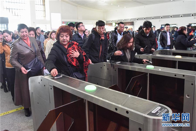 11月16日,乘坐D8803次動車組列車的乘客在吐魯番北站檢票進站。新華社記者 丁磊 攝