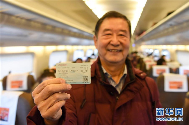 11月16日,在D8804次動車組列車上,乘客張長齡展示2014年11月16日蘭新高鐵新疆段開通的首趟列車車票。新華社記者 丁磊 攝