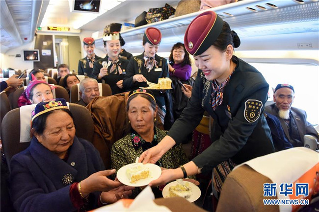 11月16日,在D8804次動車組列車上,乘務(wù)員為乘客送上蘭新高鐵新疆段開通運營五周年的“生日”蛋糕。新華社記者 丁磊 攝