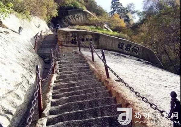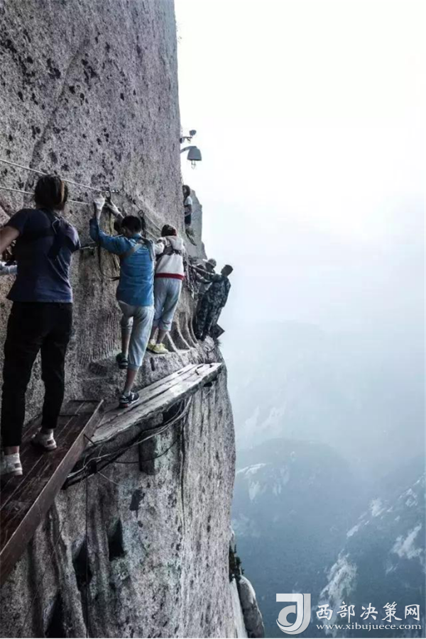 長空棧道位于華山南峰東側(cè)山腰,是華山派第一代宗師元代高道賀志真為遠離塵世靜修成仙,在萬仞絕壁上鑲嵌石釘搭木椽而筑。長空棧道的盡頭便是思過崖。