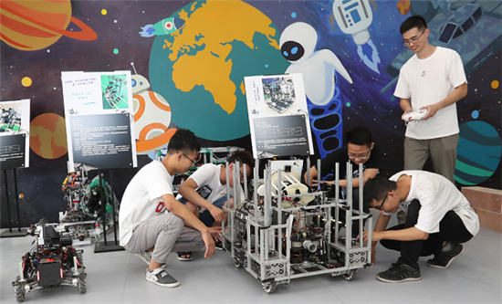 四川大學(xué)智能感知與先進(jìn)控制創(chuàng)新工坊中,團(tuán)隊(duì)帶頭人吳文強(qiáng)正在為同學(xué)們演示操作工程車機(jī)器人。 張勁松攝