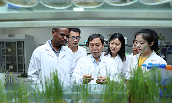 西北農(nóng)林科技大學(xué)旱區(qū)作物逆境生物學(xué)國家重點(diǎn)實(shí)驗(yàn)室小麥-條銹菌互作室里,“小麥癌癥”攻克者康振生院士正指導(dǎo)學(xué)生觀察酵母菌落培養(yǎng)情況。張勁松攝