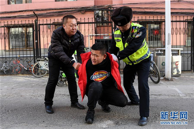 11月25日,在防暴演練現(xiàn)場(chǎng),民警和家長合作制服一名“歹徒”。
