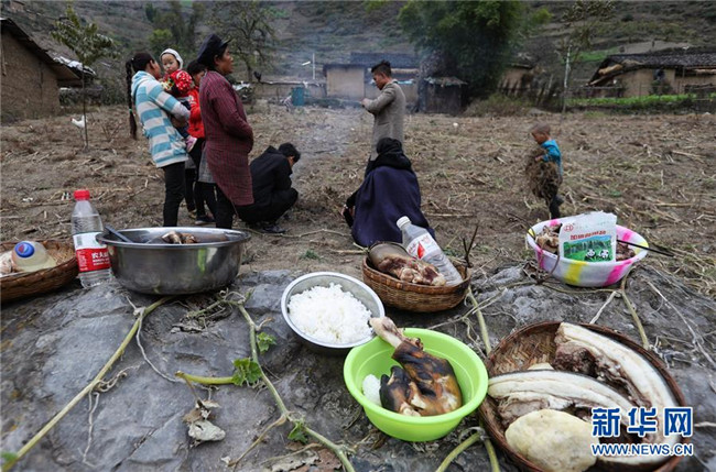 11月24日,在昭覺縣支爾莫鄉(xiāng)阿土列爾村,當(dāng)?shù)鼐用駵?zhǔn)備熟食、酒等食物祭祖,并相互贈送。