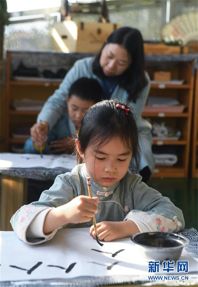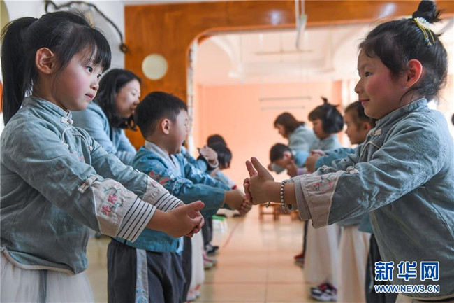 從2019年初開始,浙江省湖州市南太湖幼兒園開啟“國學(xué)課堂”,通過設(shè)立傳統(tǒng)禮儀、書法、剪紙、京劇、皮影戲等國學(xué)傳統(tǒng)文化課程,致力于將國學(xué)經(jīng)典教育滲透到幼兒日常生活學(xué)習(xí)中,培養(yǎng)幼兒的古典文化底蘊(yùn),教育幼兒從小培養(yǎng)良好的禮儀行為,讓幼兒們?cè)趥鹘y(tǒng)國學(xué)文化的滋養(yǎng)中成長。 新華社記者 徐昱 攝