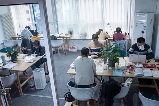 11月24日,謝雅婷在定福莊一家自習(xí)室的前臺(tái)工作。作為這家店的全職店員,她同時(shí)在備考金融學(xué)的碩士,復(fù)習(xí)與工作交替進(jìn)行。