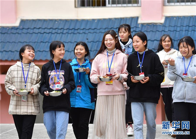 12月5日,在廣西融水苗族自治縣保桓中學(xué),林洋港(左四)和學(xué)生們從食堂打飯出來(lái)。林洋港是西北工業(yè)大學(xué)的在讀碩士研究生,今年9月來(lái)到融水苗族自治縣?;钢袑W(xué)任物理老師。新華社記者 黃孝邦 攝