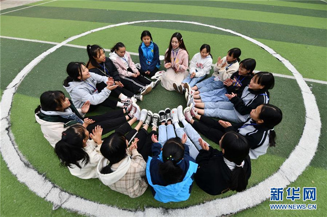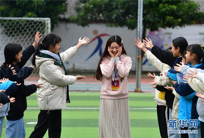 12月5日,在廣西融水苗族自治縣?;钢袑W(xué),林洋港(右三)和學(xué)生們?cè)谇驁?chǎng)上玩游戲。林洋港是西北工業(yè)大學(xué)的在讀碩士研究生,今年9月來(lái)到融水苗族自治縣?;钢袑W(xué)任物理老師。新華社記者 黃孝邦 攝