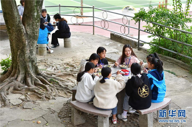 12月5日,在廣西融水苗族自治縣?;钢袑W(xué),林洋港(正面,右一)和學(xué)生們?cè)谛@里吃午飯。林洋港是西北工業(yè)大學(xué)的在讀碩士研究生,今年9月來(lái)到融水苗族自治縣?;钢袑W(xué)任物理老師。 新華社記者 黃孝邦 攝