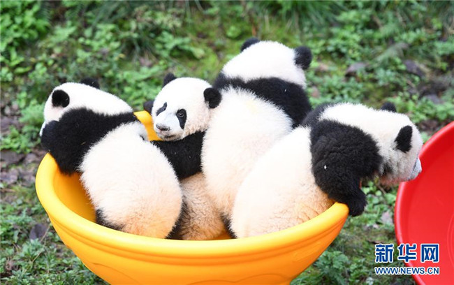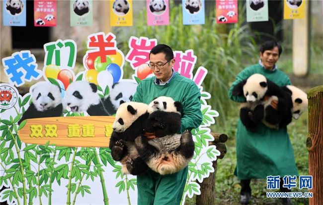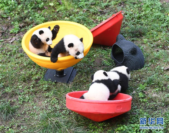 12月22日,重慶動物園4只半歲大熊貓在玩耍。當(dāng)日,重慶動物園為4只大熊貓寶寶“雙雙”“重重”“喜喜”“慶慶”舉行半歲生日慶?;顒印?只半歲大熊貓在飼養(yǎng)員的照料下,在熊貓館運動場內(nèi)玩耍、嬉戲,與市民游客一同過冬至。新華社記者唐奕攝