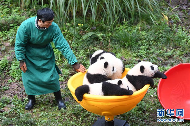 12月22日,飼養(yǎng)員引導(dǎo)大熊貓寶寶到戶外運動。當(dāng)日,重慶動物園為4只大熊貓寶寶“雙雙”“重重”“喜喜”“慶慶”舉行半歲生日慶?;顒印?只半歲大熊貓在飼養(yǎng)員的照料下,在熊貓館運動場內(nèi)玩耍、嬉戲,與市民游客一同過冬至。新華社記者唐奕攝