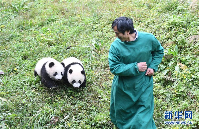 12月22日,飼養(yǎng)員引導(dǎo)兩只半歲大熊貓在戶外運動。當(dāng)日,重慶動物園為4只大熊貓寶寶“雙雙”“重重”“喜喜”“慶慶”舉行半歲生日慶?;顒印?只半歲大熊貓在飼養(yǎng)員的照料下,在熊貓館運動場內(nèi)玩耍、嬉戲,與市民游客一同過冬至。新華社記者唐奕攝