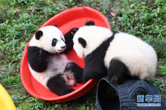 12月22日,重慶動物園兩只半歲大熊貓在玩耍。當(dāng)日,重慶動物園為4只大熊貓寶寶“雙雙”“重重”“喜喜”“慶慶”舉行半歲生日慶?;顒?。4只半歲大熊貓在飼養(yǎng)員的照料下,在熊貓館運動場內(nèi)玩耍、嬉戲,與市民游客一同過冬至。新華社記者唐奕攝