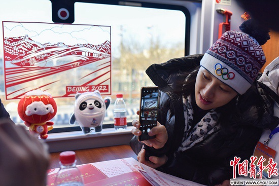 一名乘客正在拍攝2022年北京冬奧會吉祥物和車窗上的窗花。這些剪紙窗花是由張家口蔚縣剪紙藝人創(chuàng)作,包含了詹天佑畫像、京張高鐵和冰雪運(yùn)動等元素。實習(xí)生 宋欣然/攝