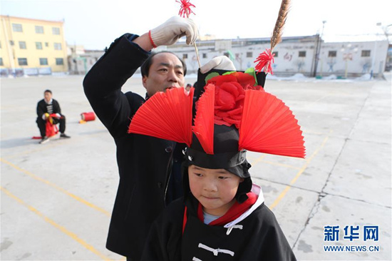 1月9日,在甘肅省武威市涼州區(qū)四壩鎮(zhèn)九年制學(xué)校,攻鼓子指導(dǎo)老師楊萬航(左)為學(xué)生示范動作。