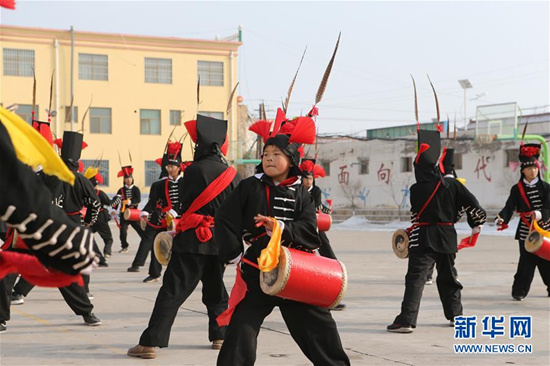 攻鼓子是發(fā)源于甘肅武威的一種民間鼓樂舞蹈,表演風(fēng)格渾厚豪邁、威武雄壯,具有強(qiáng)烈的地域特色。2008年,涼州攻鼓子被列為第二批國家級非物質(zhì)文化遺產(chǎn)。為更好地傳承這項非物質(zhì)文化遺產(chǎn),甘肅省武威市涼州區(qū)四壩鎮(zhèn)九年制學(xué)校組建攻鼓子藝術(shù)社團(tuán),開設(shè)攻鼓子校本課,定期由當(dāng)?shù)毓ス淖哟硇詡鞒腥藢W(xué)生進(jìn)行指導(dǎo),推動“非遺”攻鼓子藝術(shù)教育普及。 新華社記者 耿馨寧 攝